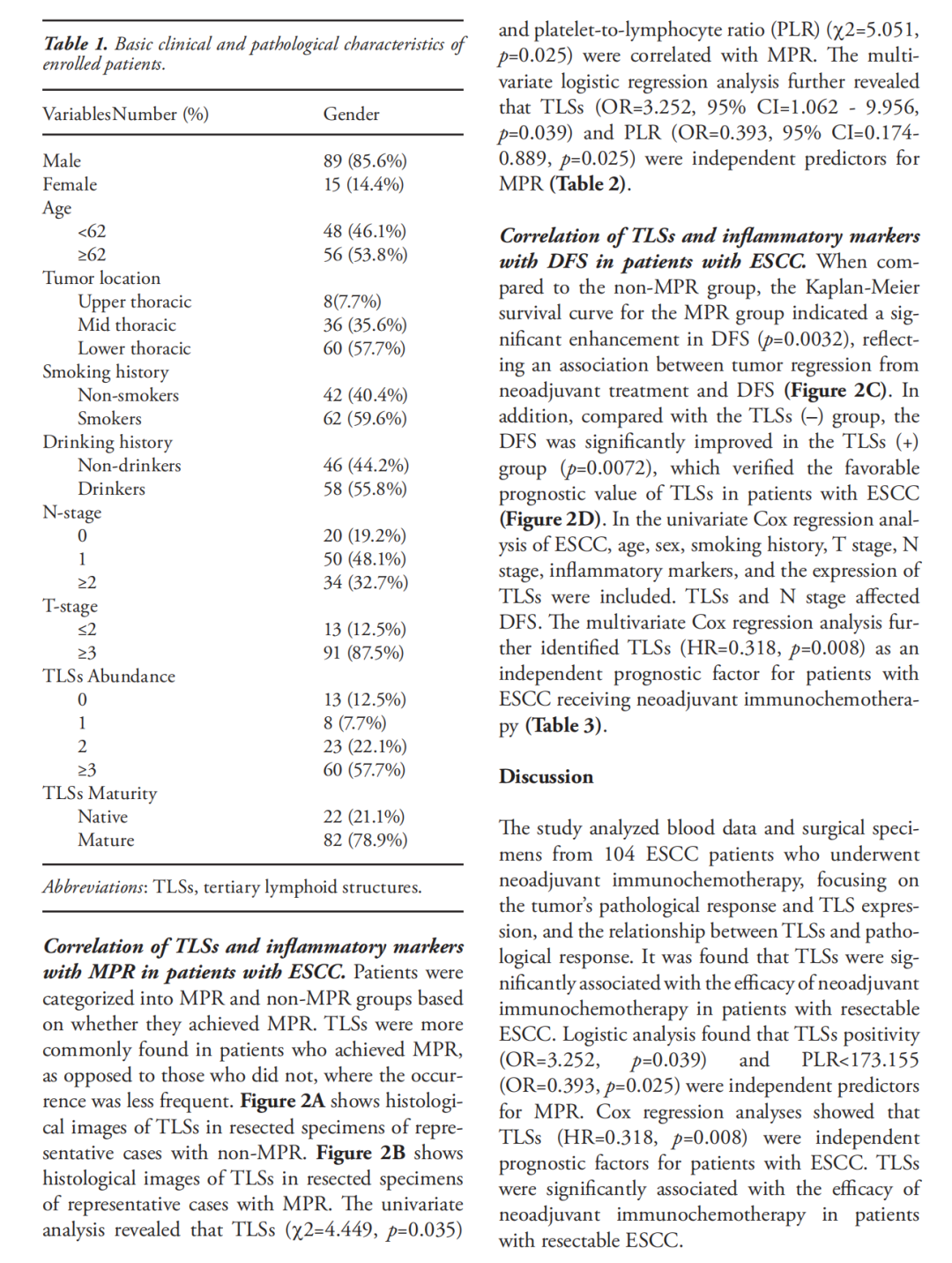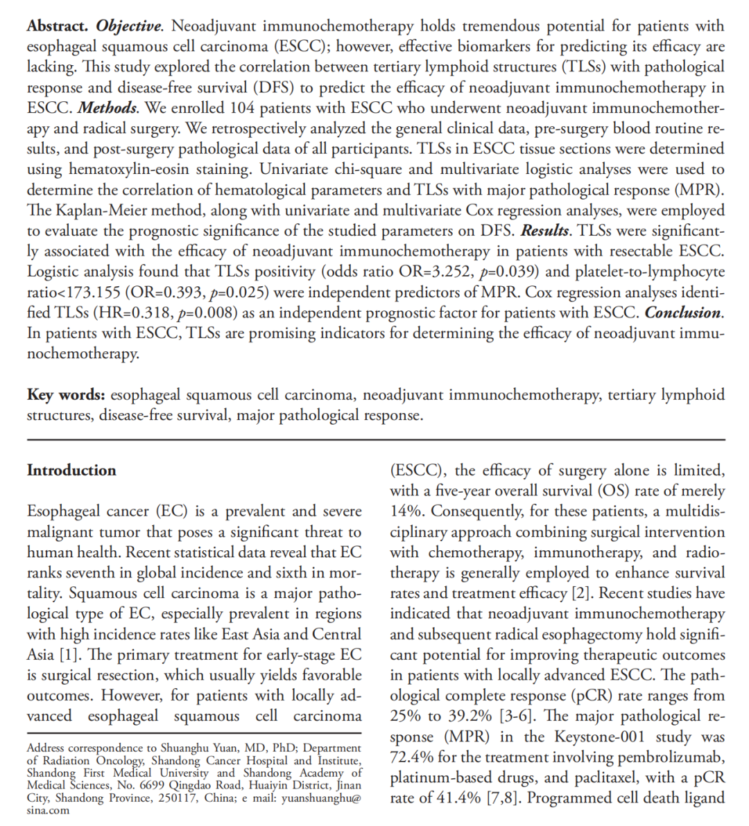 1.三级淋巴结构阳性(TLSs+)是食管鳞癌患者新辅助免疫化疗主要病理缓解的独立预测因子,阳性患者治疗有效应答概率显著提升;
