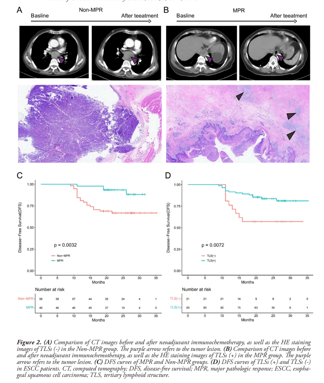针对这一临床难题,戎文文医师作为本研究的第一作者,开展了深入研究,采用苏木精-伊红染色、免疫组化等专业技术,对肿瘤组织中三级淋巴结构的存在、丰度及成熟度进行精准检测与评估,同时运用卡方检验、多因素逻辑回归分析、Cox回归分析等多种统计学方法,深入探究三级淋巴结构与患者主要病理缓解(MPR)、无病生存期(DFS)的内在关联,成功弥补了这一临床短板,并取得多项突破性成果:
