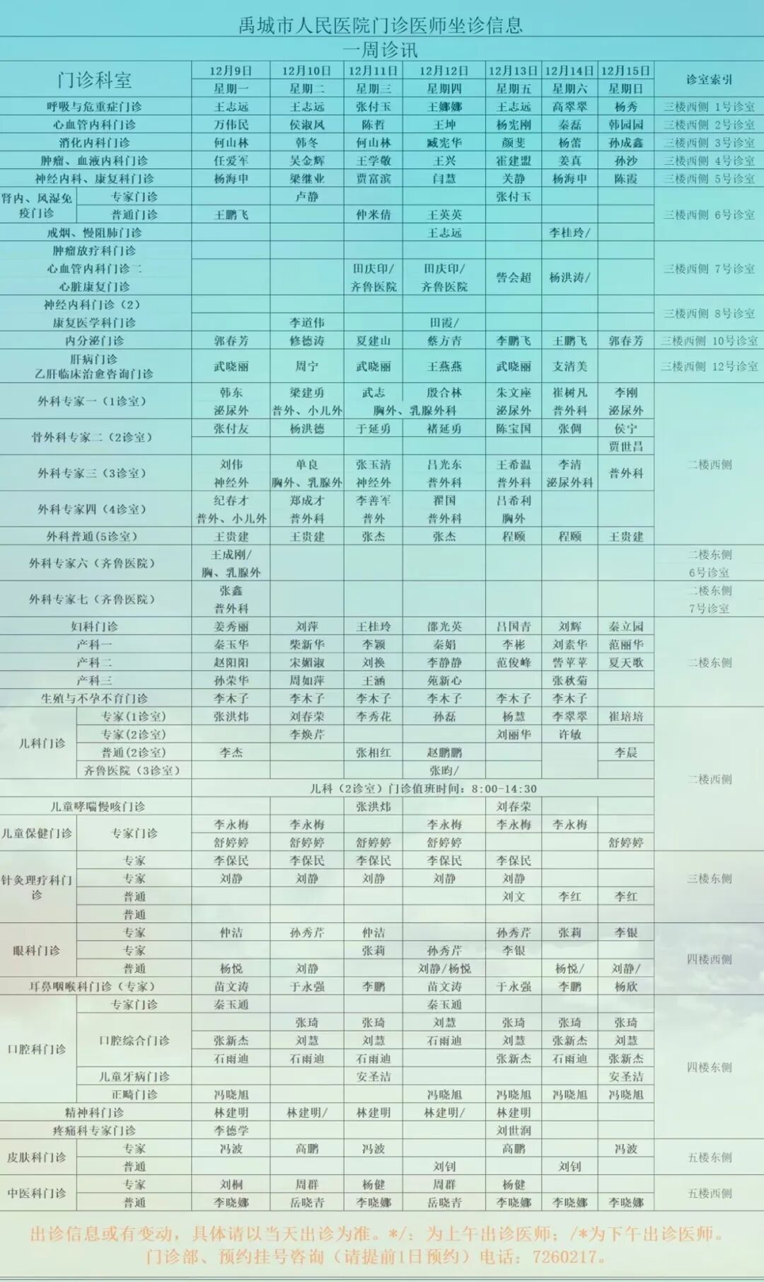 出诊信息或有变动,具体以当天出诊为准,门诊部咨询电话: 7260217。