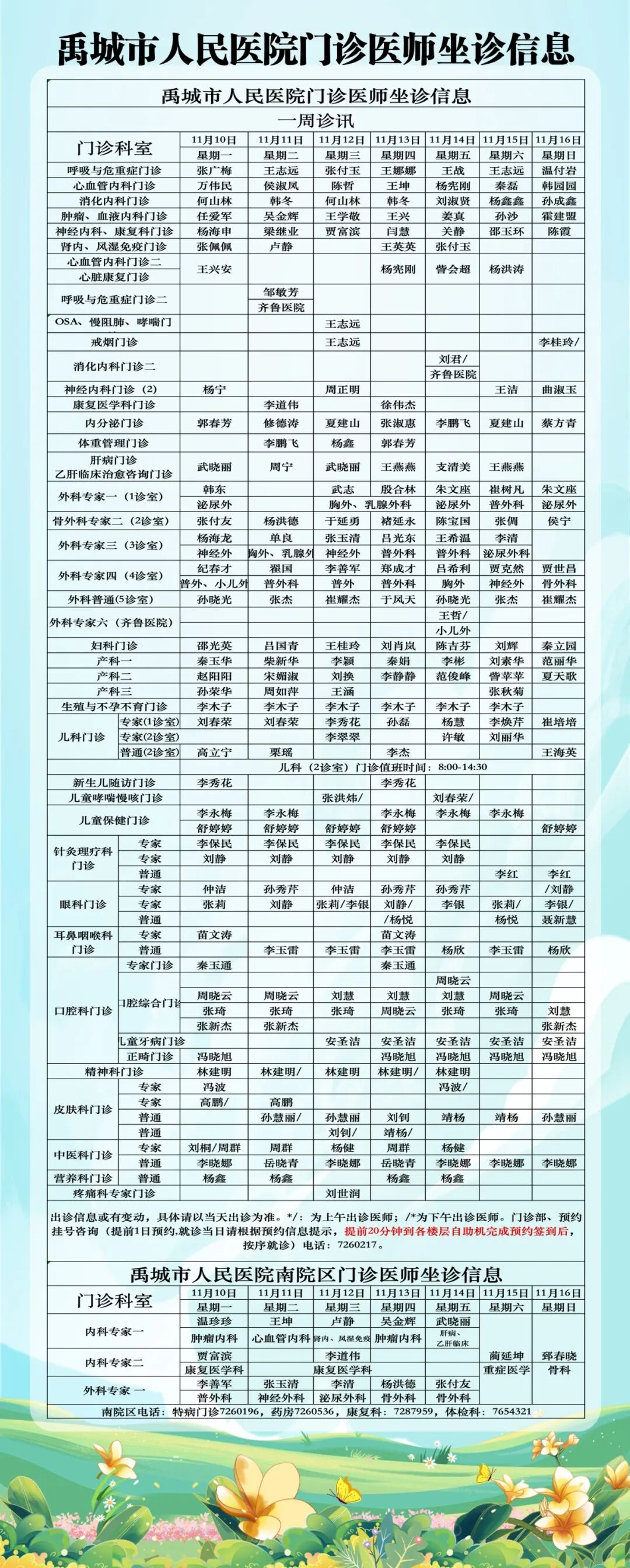 禹医便民 | 禹城市人民医院门诊医师11月10日至11月16日坐诊信息