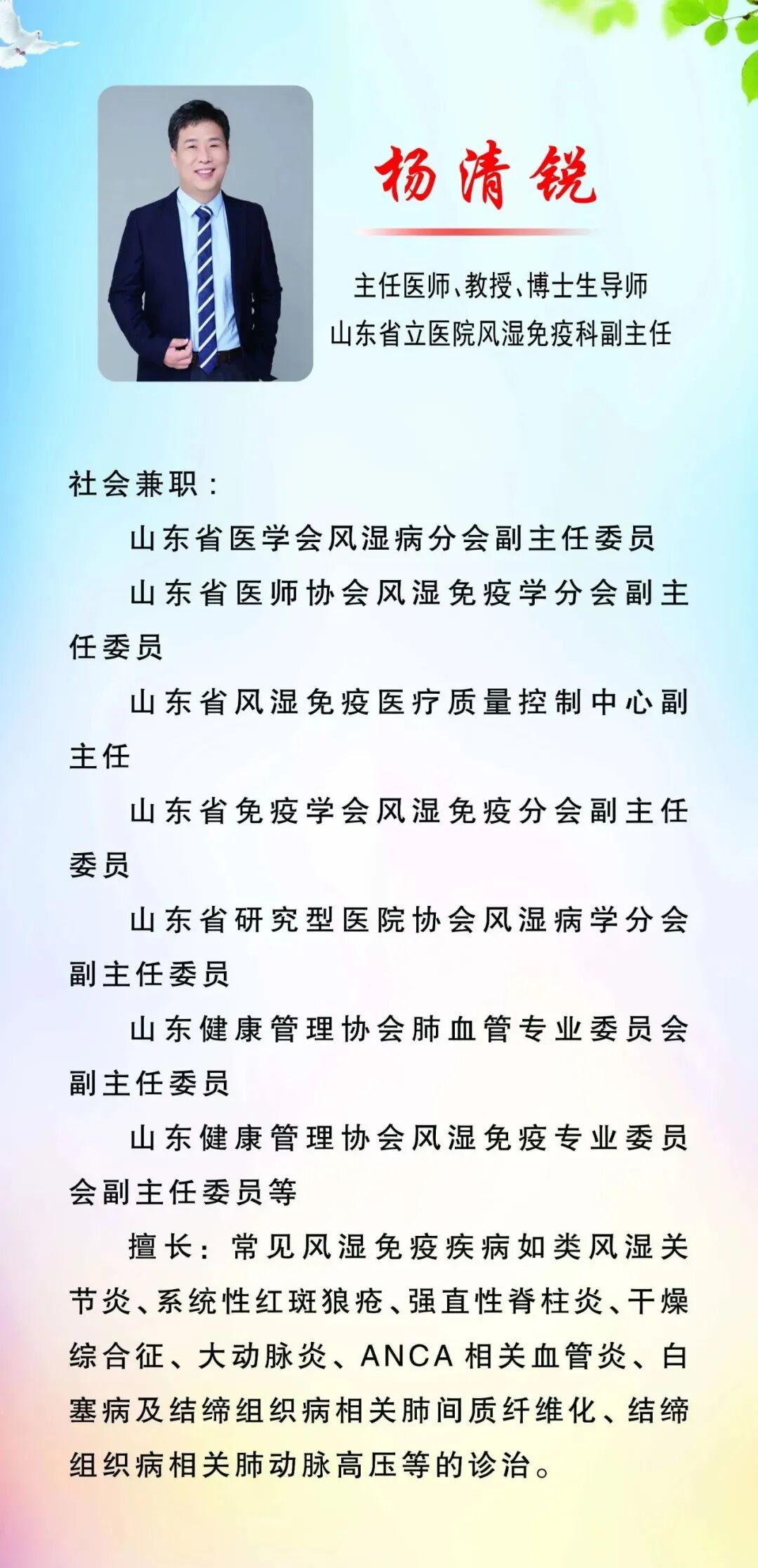 名医预告省立医院免疫科杨清锐教授12月6号上午莅临我院坐诊请速预约