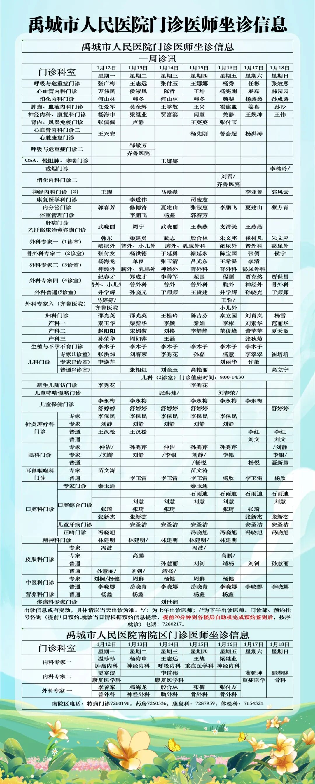 禹医便民 | 禹城市人民医院门诊医师1月12日至1月18日坐诊信息